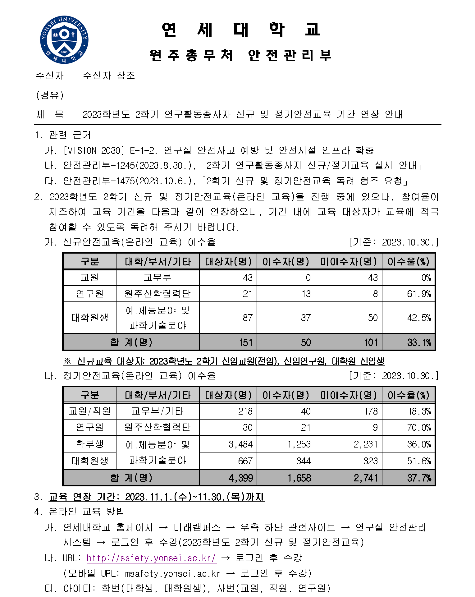 2023학년도 2학기 연구활동종사자 신규 및 정기안전교육 기간 연장 안내
